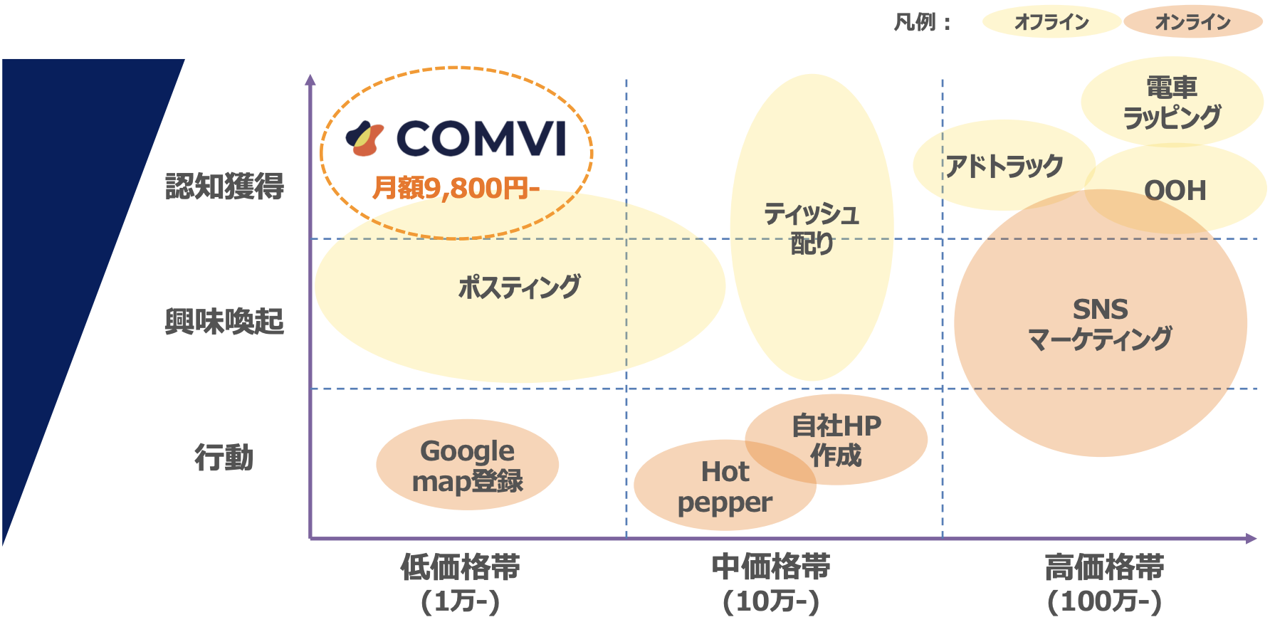 | OOH | 認知獲得 | 数千万〜 300万/日 | 20万人/日 | 10円/人 | 低〜高 |