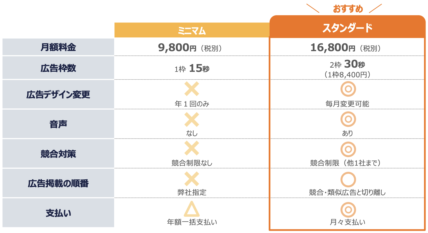 | 広告掲載の順番 | 弊社指定 | 競合・類似広告と切り離し |
