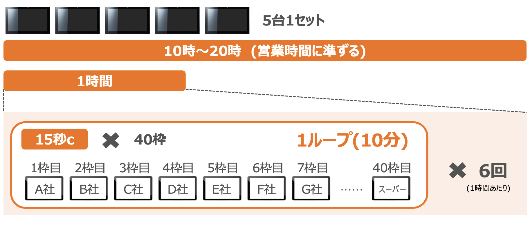 | デジタルサイネージ仕様(概要) | ・5台で1店舗セット、1枠15秒×40枠(10分ループ) ・電気代の目安:1ヶ月325.5円(1日10時間使用時) ・形式:MP4 / JPG / PNG 入稿可能 |